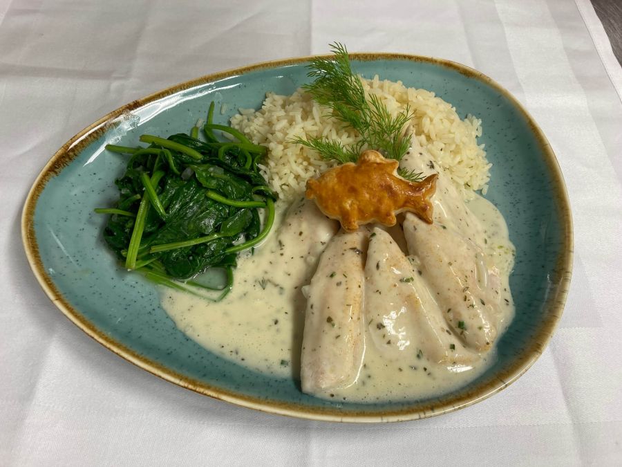 in Weisswein-Kräuterrahm-Sauce dazu Reis und Spinat