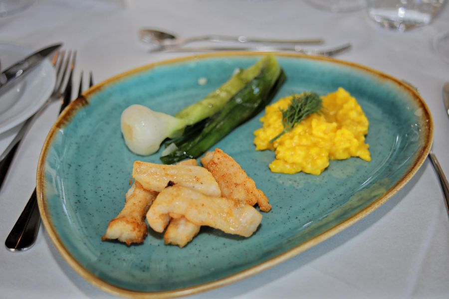 pochiert in Butterweisswein-Sauce mit speziellen Kräutern dazu Reis